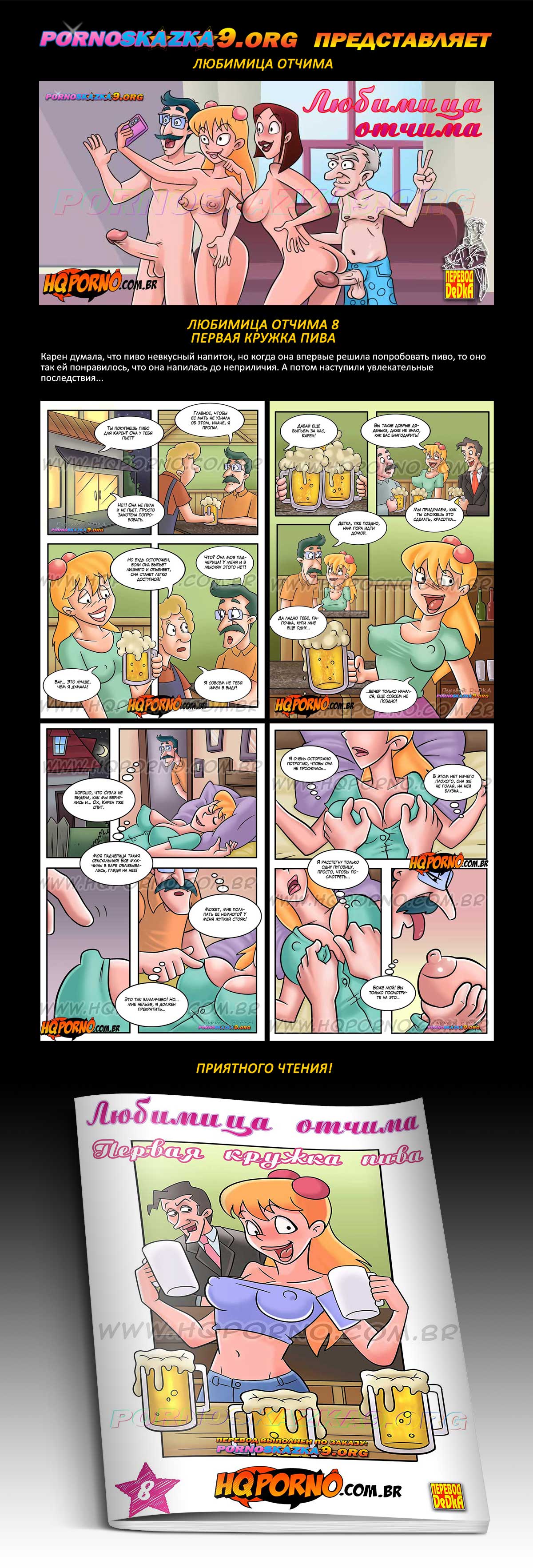 Порно комикс «Любимица отчима. Часть 8. Первая кружка пива.» Карен думала, что пиво невкусный напиток, но когда она впервые решила попробовать пиво, то оно так ей понравилось, что она напилась до неприличия. А потом наступили увлекательные последствия…